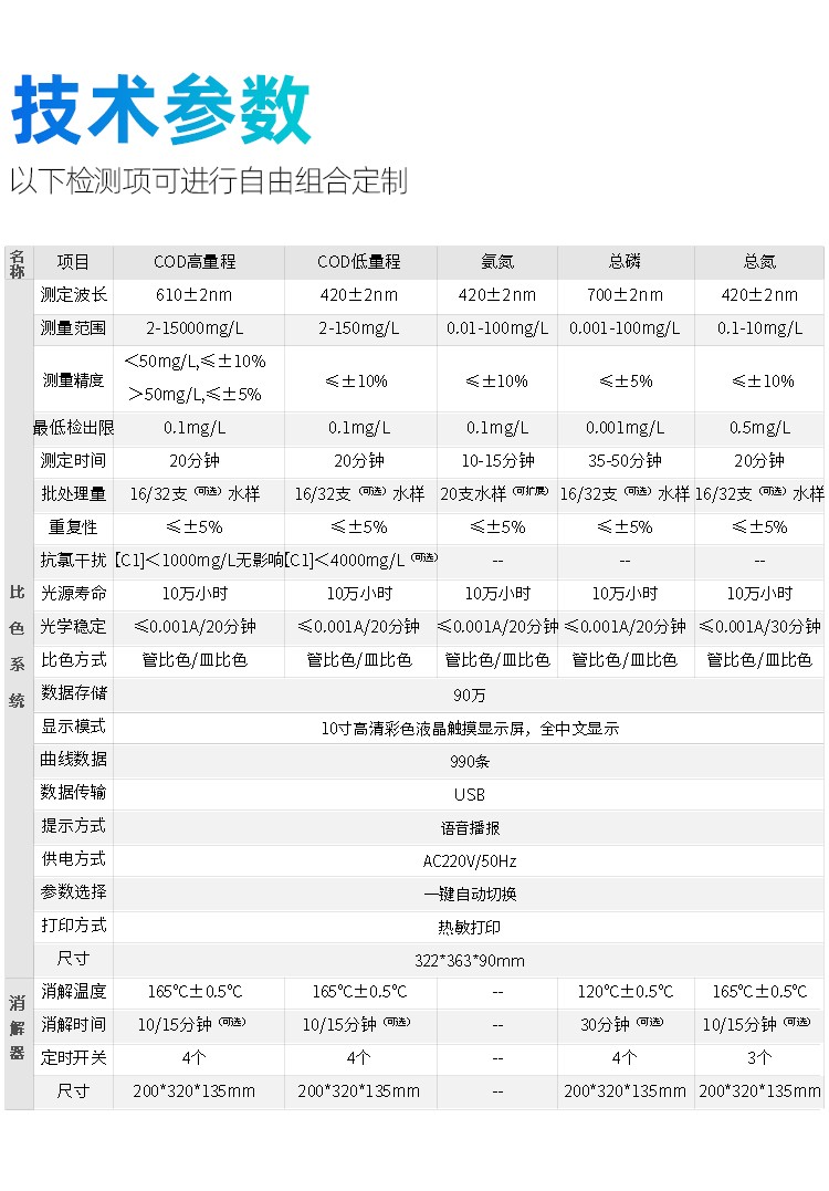 人工智能語音播報提示,可隨意調節音量, 使用更方便更 配備112種預先編程的曲線,曲線數量990條,可濃度直讀,測量結果更精密; 具有數據存儲功能,可存儲90萬組數據,并能自由查看; 10寸彩色液晶顯示觸摸屏,全中文操作模式,更便于操作掌握; 儀器自備校準功能,可根據標準樣品計算, 并存儲曲線,無需手動制作曲線; 配備USB接口傳輸功能,自帶打印機,可打印當前數據及存儲的歷史數據; 采用管比色、皿比色,雙比色系統